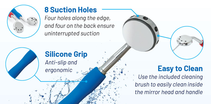 A revolutionary tool designed to enhance your dental experience. With its advanced high volume suction feature, you can work without disturbing your patients and maintain a clear view, even in the most challenging situations. The mirror's smooth and gentle surface makes it comfortable to use on patients of all ages, and its ability to clear fog and water means you'll never have to worry about a cloudy view. Plus, its retraction ability makes it easy to use on strong tongues and lips, and patients love it! With quality reflection and a crisp, clear image, you'll be able to work with confidence and precision.
